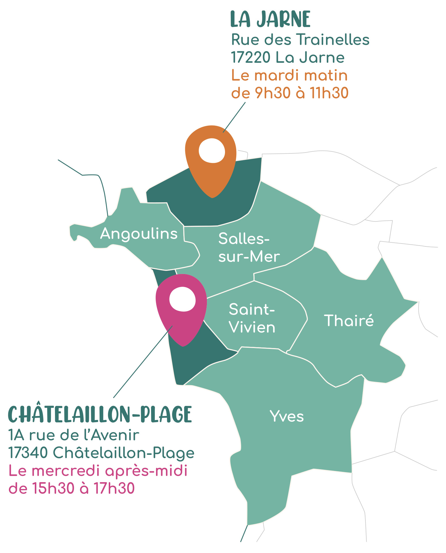 • Le mercredi après-midi de 15h30 à 17h30 à Châtelaillon-Plage 1A rue de l’Avenir